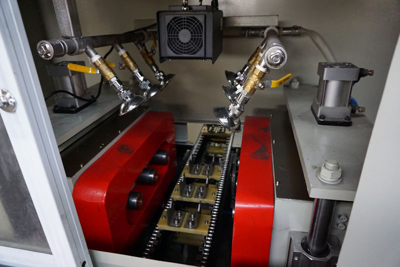 自動程序為:上料定位→輸送→夾緊→噴灑→磁化→松開→輸送→工件進入觀察臺→觀察→退磁→下料。